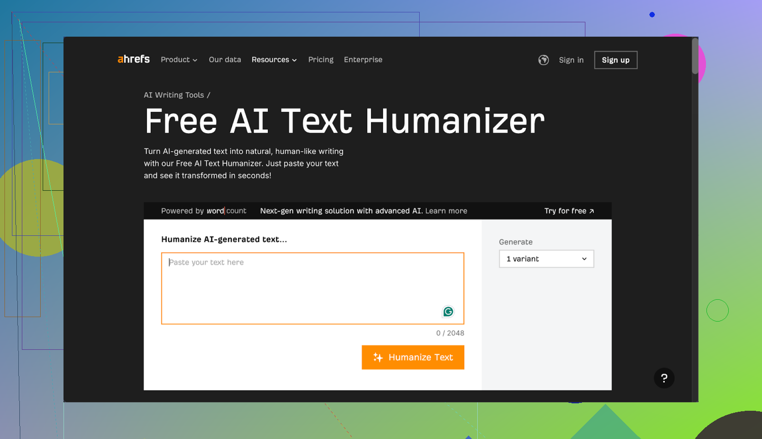 The humanizer sits inside Ahrefs’ Word Count platform.