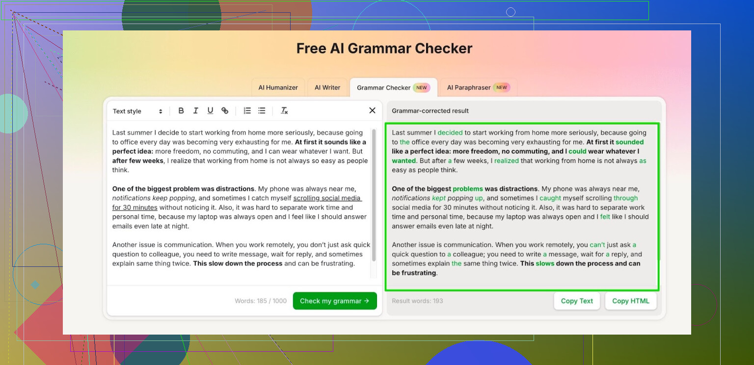 - Usa el Free AI Grammar Checker para lo importante, donde los errores duelen de verdad: currículums, resúmenes de LinkedIn, correos largos a jefes o clientes y artículos de blog.