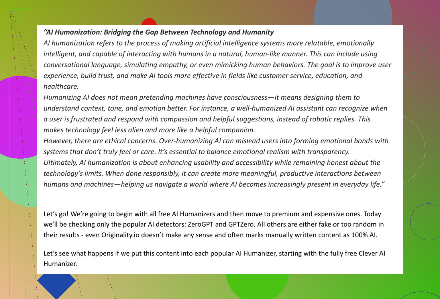 Here’s my process—super basic but reliable. I whipped up a totally AI-generated essay using ChatGPT. No tweaks, no edits, just straight-up artificial intelligence parroting back an answer about (you guessed it) ‘AI humanization.’ Why not see how their system chews on exactly what the detectors are built to spot?