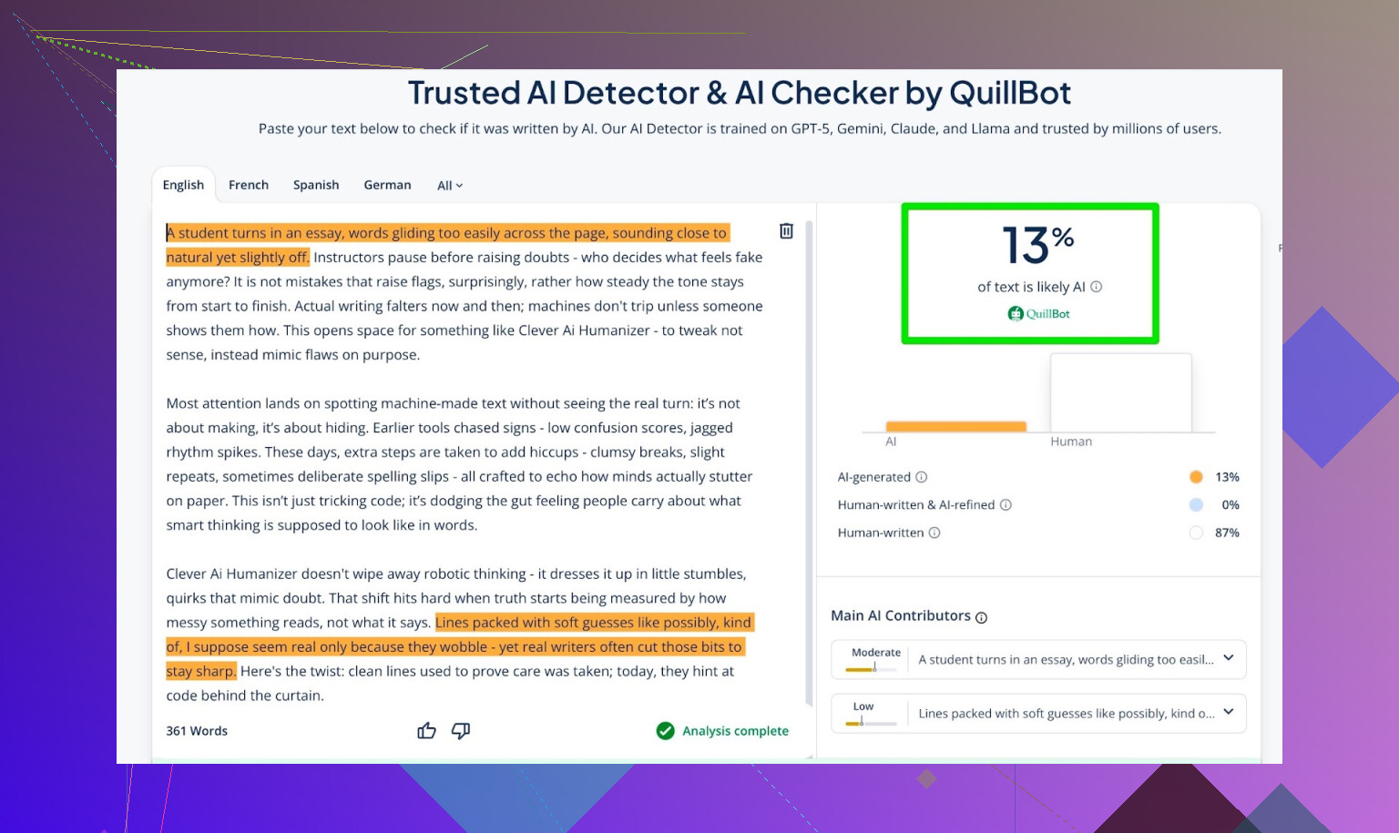 Selbst über drei verschiedene Checker hinweg ist der AI-Anteil also niedrig. Die 13 % von QuillBot sind in den meisten realen Szenarien völlig unproblematisch.