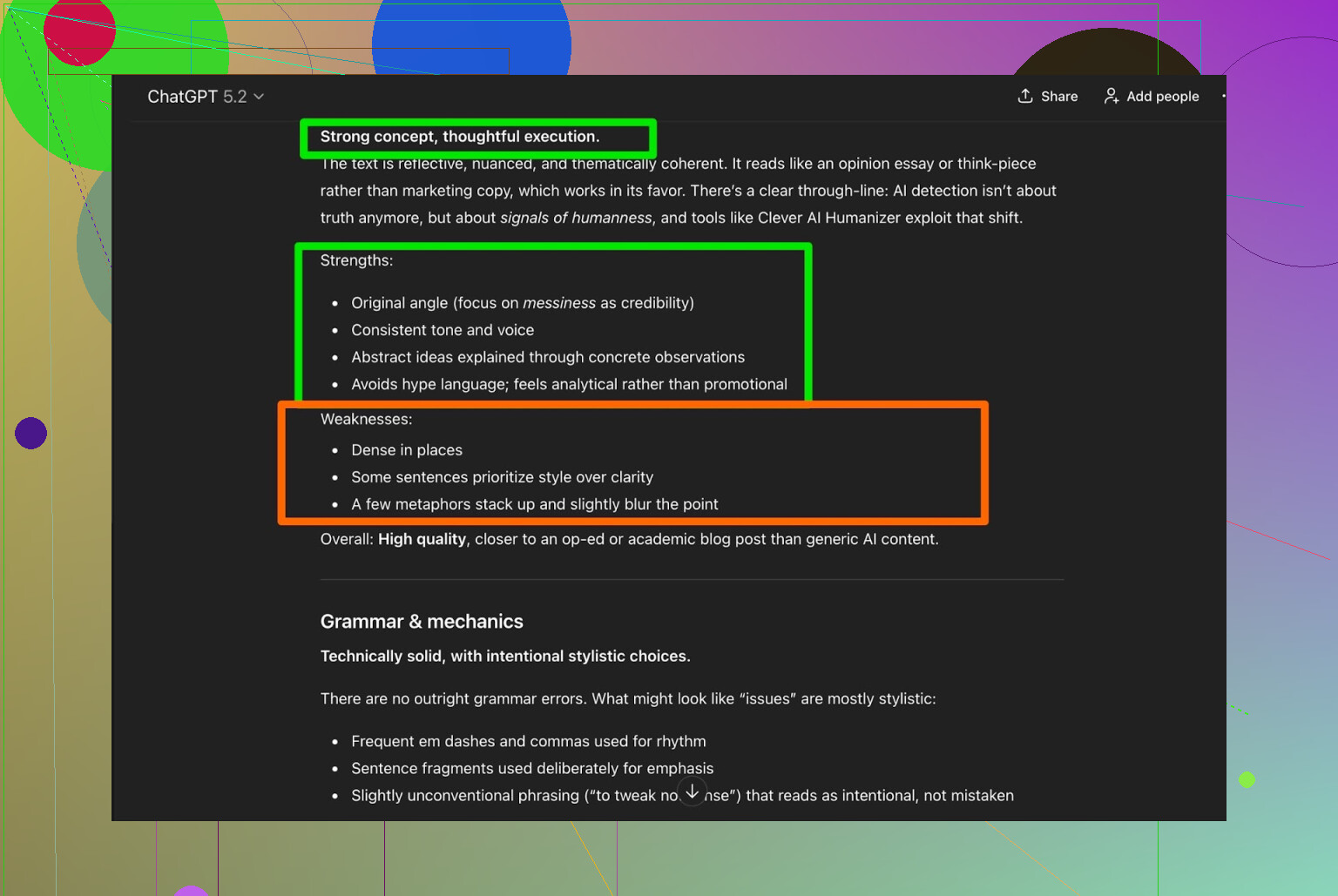 - ChatGPT 5.2 gebeten, einen komplett AI-generierten Text über Clever AI Humanizer zu schreiben.
