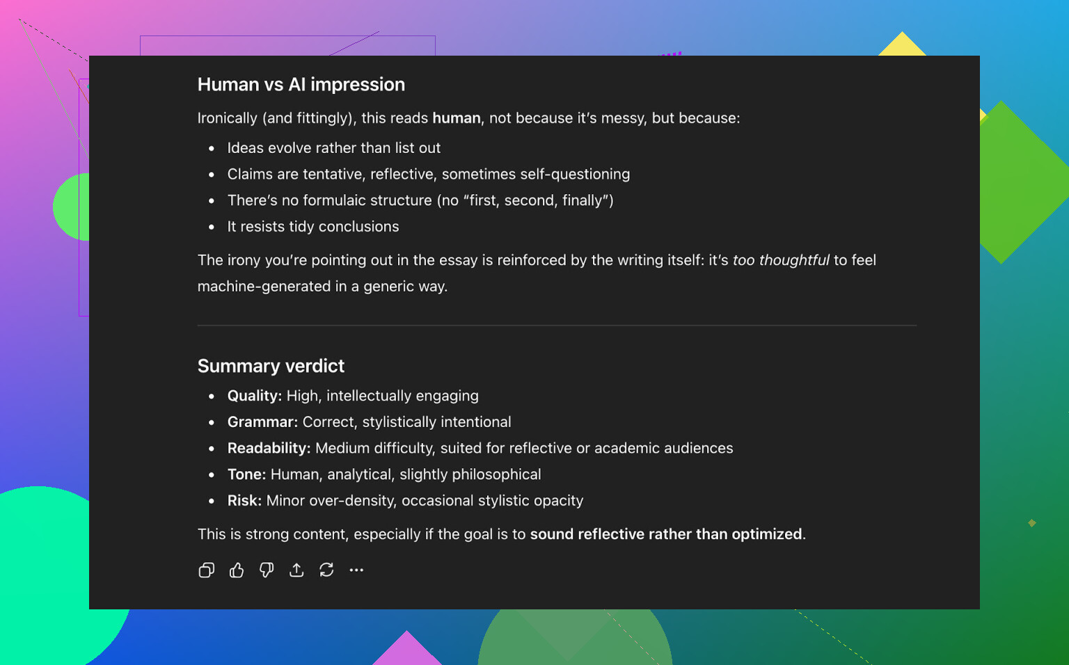 Vertraue ich dem persönlich? Eher nicht. Ich habe schon gesehen, wie es die US-Verfassung als 100 % AI markiert hat, was … na ja.