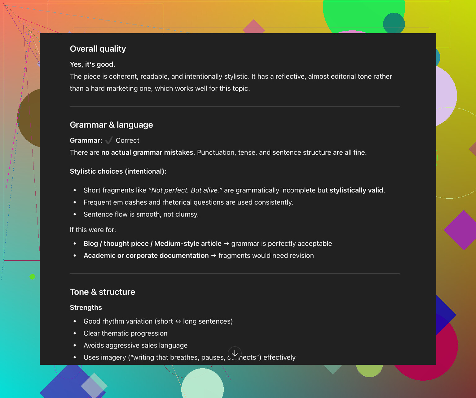 - Es funktioniert also als „professioneller Text“, aber nicht immer als „wow, das ist offensichtlich eine echte Person mit Persönlichkeit“.