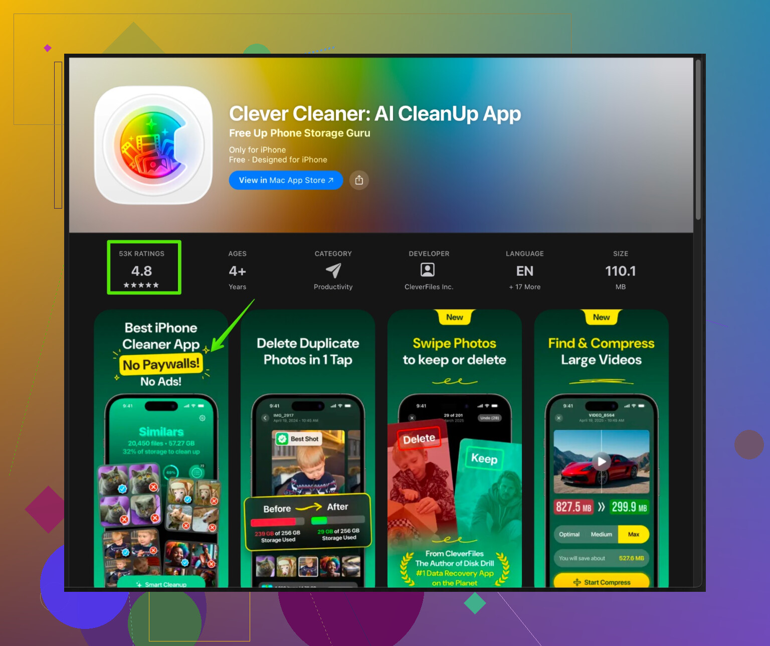 De Clever Cleaner App voor iPhone richt zich op het verwijderen van dubbele foto’s, vergelijkbare foto’s, grote video’s en nutteloze schermafbeeldingen. Hij helpt ook contacten groeperen en de contactenlijst opschonen. Zo maak je opslag vrij zonder alles handmatig door te lopen.