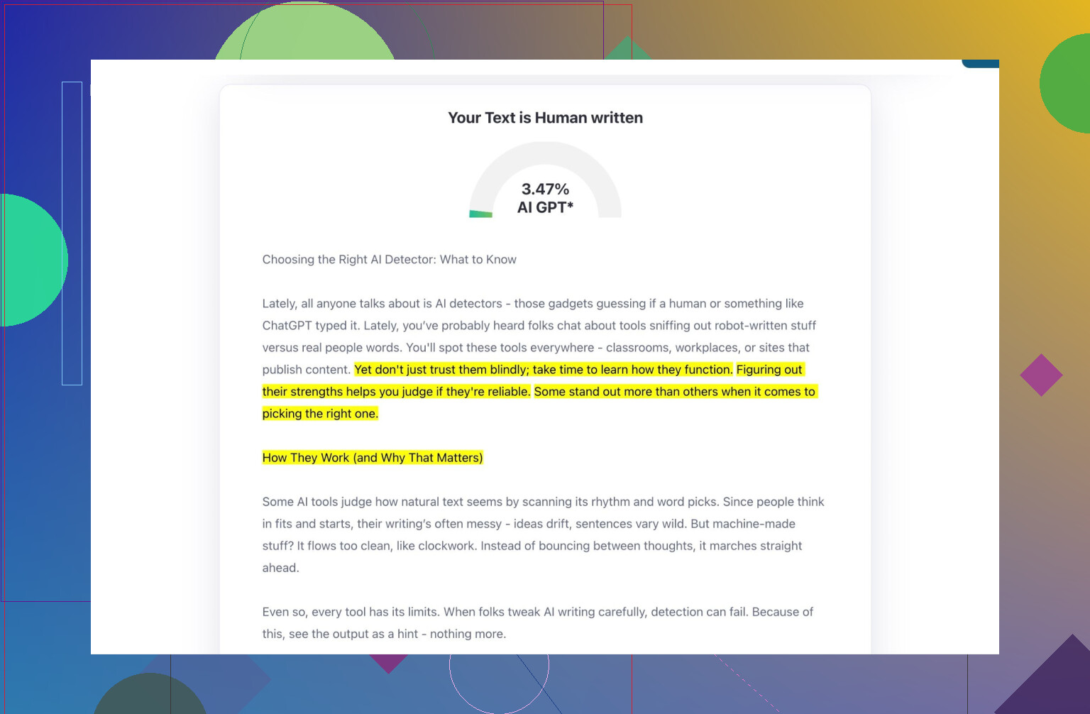 Finally: don’t just rely on what shows up on the AI detector dashboard. Read it out loud. If you wanna cringe, fix it, then let the tool polish it off if needed. I guess what I’m saying is, human writing isn’t about perfection. It’s about all the glorious messiness. Lean into that a bit, and suddenly everyone thinks you really wrote it, typos and all.