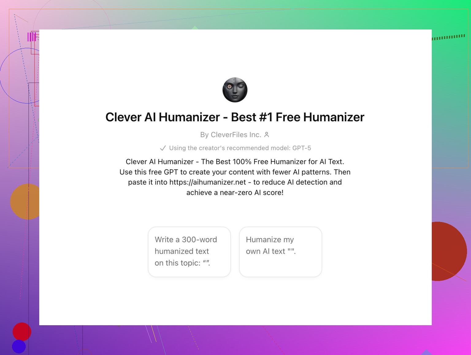 A bunch of people are raving about Clever AI Humanizer. But the real kicker? Don’t just feed it straight-up ChatGPT content. Instead, use this custom GPT set up at GPT Humanizer on ChatGPT. Supposedly, this version generates drafts that don’t have as many classic “AI tells”—you know, those weird patterns detectors sniff out like a bloodhound on a steak truck.