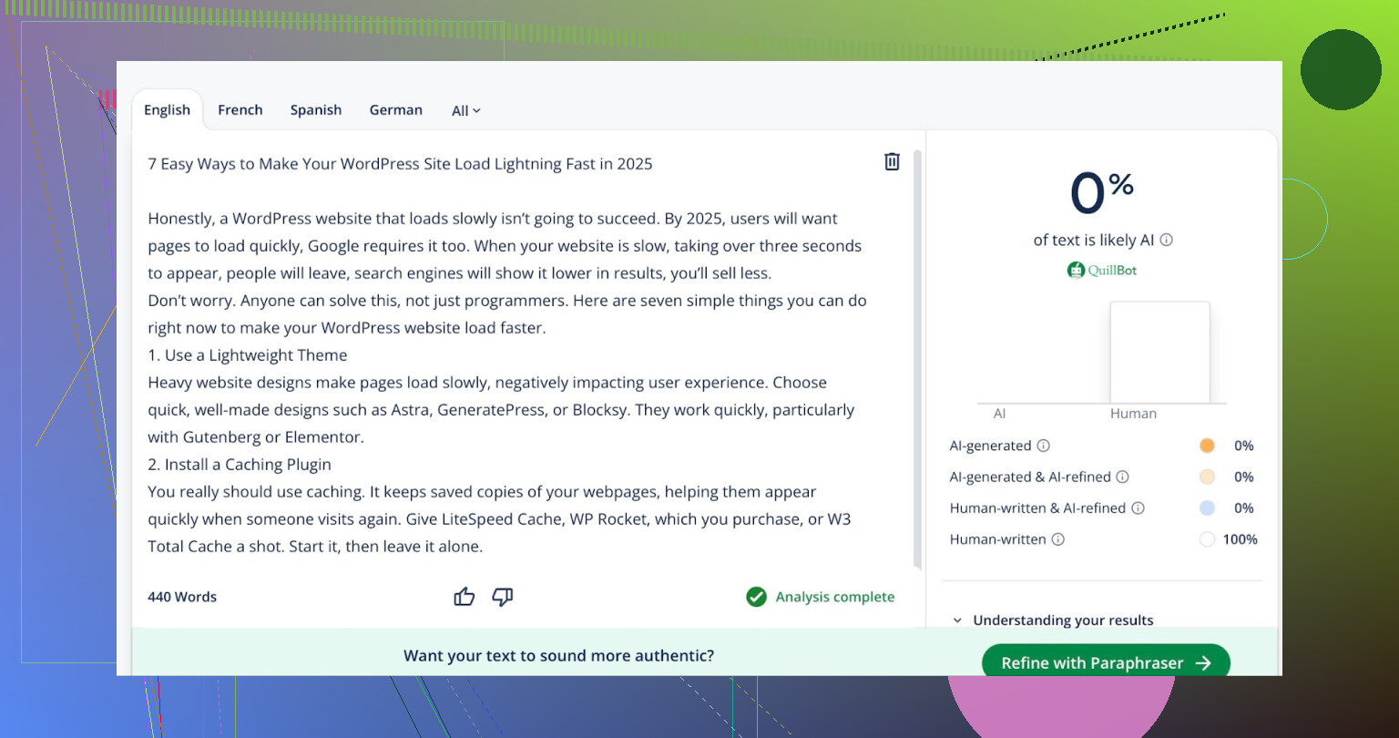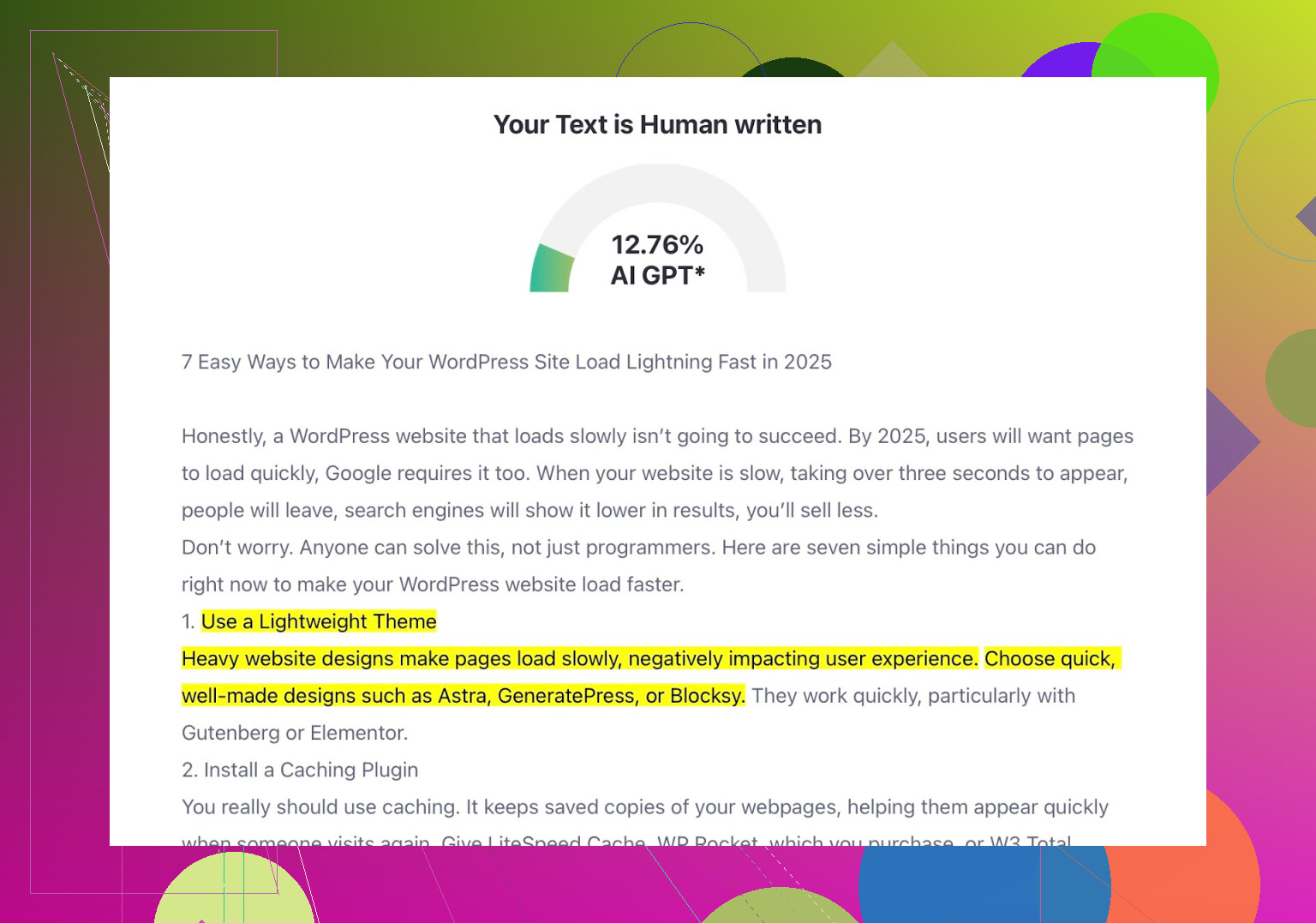 BUT (and this is a big but), just because the detectors can’t tell doesn’t mean an actual human reader won’t sniff out the stiff bits. Sometimes, the output feels like someone who just pounded three Red Bulls and is speaking with extra pauses and weird word choices. In those cases, you’re gonna want to go in and do a little hand-tuning. I also noticed it tends to play things kinda safe—goodbye, any spices or quirks in your tone, sometimes.