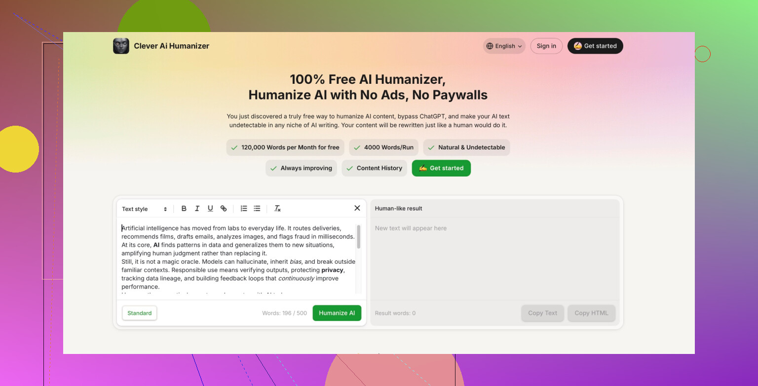 So, here’s the real deal—if you’re like me and have stared at way too many “AI text” detectors, you know there’s a balancing act between content that’s human-sounding and stuff that’s just overloaded with fancy fluff. Now, I stumbled on Clever AI Humanizer, and honestly? It’s free, doesn’t load you up with pop-ups, and the UI isn’t an eyesore. Here’s the direct link: https://aihumanizer.net.