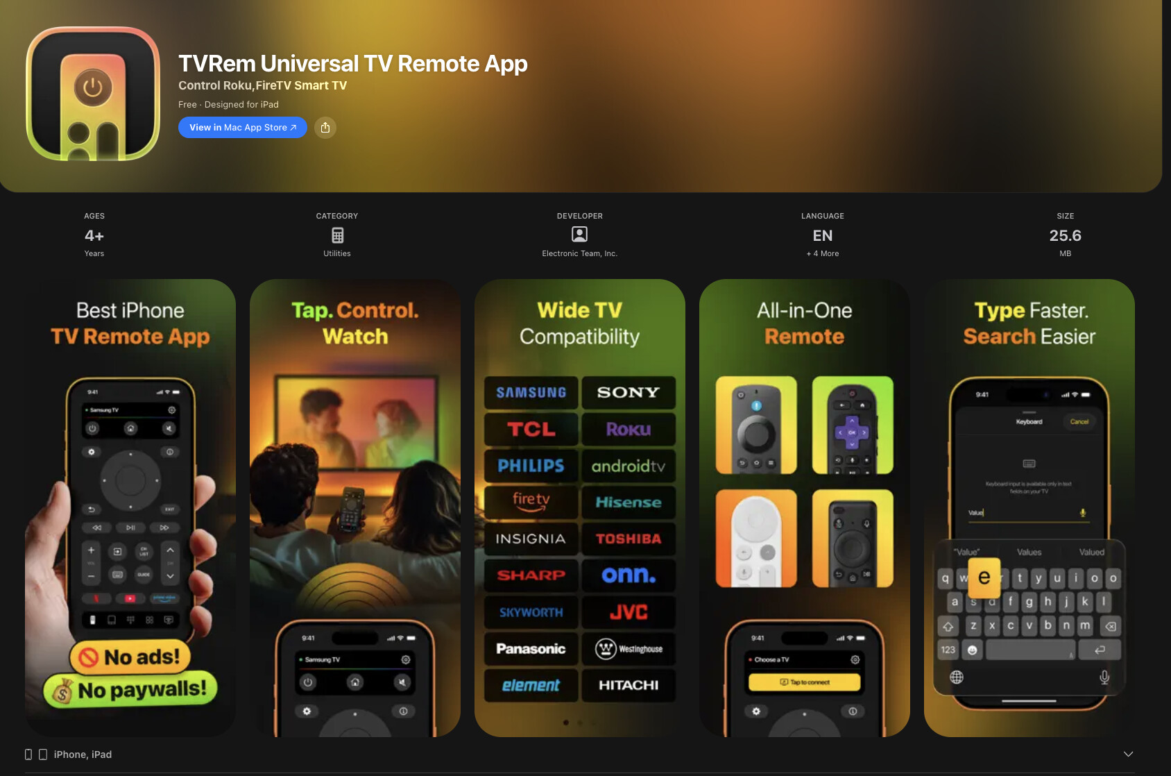Va bene, analizziamo la cosa. Universal Remote | Smart TV è l’app che più si avvicina al “tutto in uno” per iPhone, finché tutti i tuoi dispositivi sono effettivamente sulla tua rete Wi-Fi e non bloccati nell’Età della Pietra tecnologica. I pro: interfaccia super pulita (niente momenti da “dov’è accidenti il muto?”), configurazione rapida, riconosce la maggior parte delle smart TV e dei box streaming senza drammi, e la tastiera integrata è una svolta ogni volta che devi inserire una password di streaming assurda.
