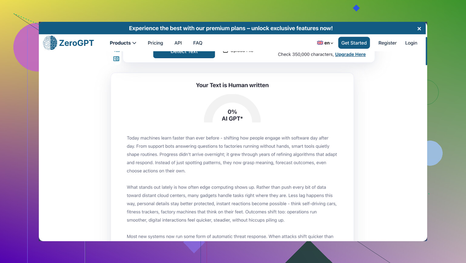 • ZeroGPT gave perfect “human” passes on all my test pieces